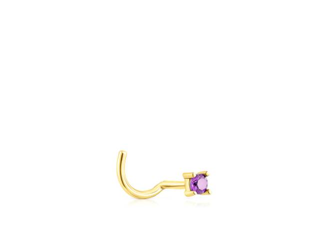 En esta ocasión se trata de un piercing de nariz de acero IP en tono dorado y culminado con una amatista, aunque lo tienes disponible con piedras de varios colores. También de la colección St. Tropez Steel, como los pendientes anteriores.