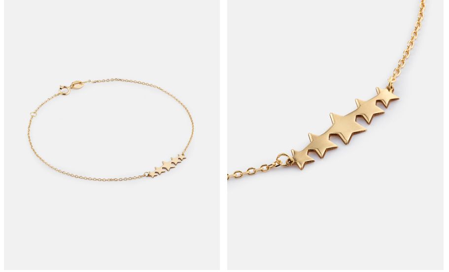 Otra propuesta perfecta de pulsera es esta totalmente diferente a la que hemos visto pero igualmente elegante, con clase y sencillez sofisticada, aunque sea contradictorio. Quien se la ponga o la reciba seguramente formará parte todo el día de su atuendo. Es una pulsera Estrellas de oro, en oro amarillo de 750 milésimas (18 quilates. En este enlace la puedes comprar por 145 euros.