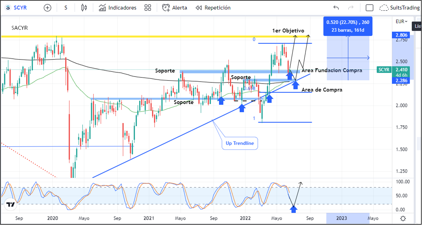 La estructura actual de las acciones de Sacyr presenta un retroceso que se sostiene sobre uno de los soportes más representativos de mayo de 2021 en inmediaciones de 2,36 euros. Desde este nivel, el precio puede generar el impacto al alza apoyado de la formación de truco (V invertida) sobre dicho soporte, con lo cual estimaríamos posición de fundación en compra en las acciones de Sacyr arriba de 2,4 euros con un primer objetivo en los máximos de 2020, que corresponden a los niveles previos a la pandemia arriba de 2,8 euros. Operación que otorgaría más de un 16% de beneficio estimado al corto plazo.