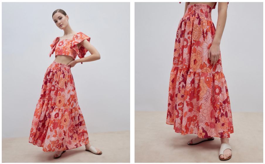 Y de lo más liso e ibicenco, a lo más colorido y florar, con esta en estampado y con otro 40% de descuento. Se vende en tonos naranja, como en la foto, con cintura elástica y más pensado no sólo para el día a día sino para una ocasión especial. También está hecha 100% en algodón y te apuntamos algo muy importante, aunque aquí no lo tocamos: casi todos estos modelos tiene su combinación a juego en tops, con descuentos similares, con lo que podrás hacerte con varios conjuntos irresistibles casi a mitad de precio todo. En este enlace puedes comprar esta falda en concreto por 29,99 euros y debajo de su ficha tienes el top a juego que te comentamos.