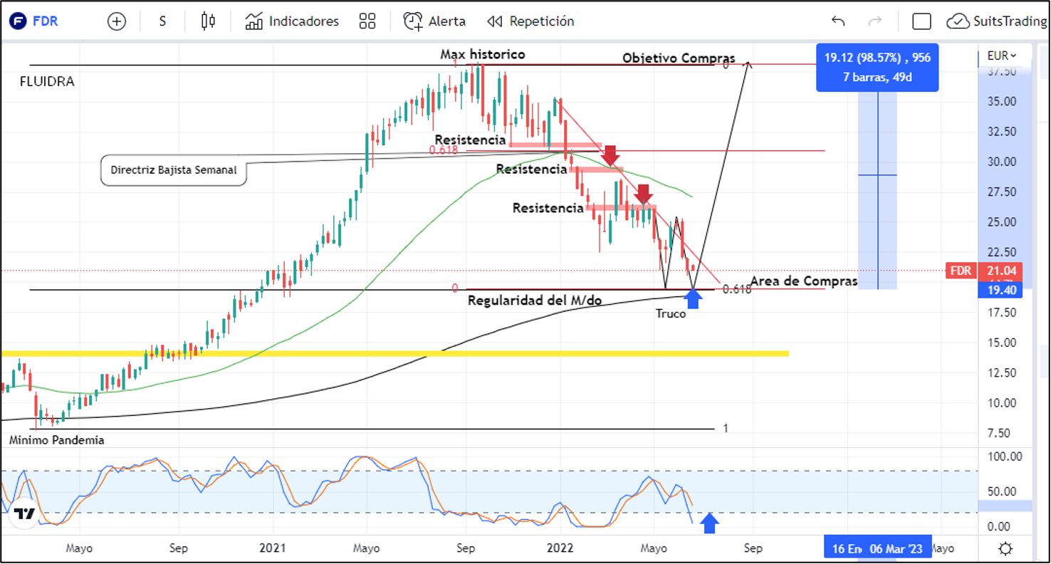 El precio deberá visitar niveles cercanos a 19,3 euros que corresponden al 61,8 de retroceso de Fibonacci de toda la extensión desde el mínimo registrado por la pandemia hasta su máximo histórico. En esta área, deberá realizar un movimiento de truco, es decir, V invertida que confirme el fin de las caídas y que apoyado de la media móvil exponencial de 250 periodos de largo plazo y del índice de fuerza relativa que deberá estar por debajo de los 20 puntos, indicará la potencial oportunidad de compra en busca de un primer objetivo en inmediaciones de 30 euros que corresponden a áreas de pánico de toda la caída previa y que, de llevarse con solidez, ubica un segundo objetivo en los máximos históricos arriba de 38 euros lo que corresponde a entre 60% y 98% de beneficioestimado al mediano y largo plazo.