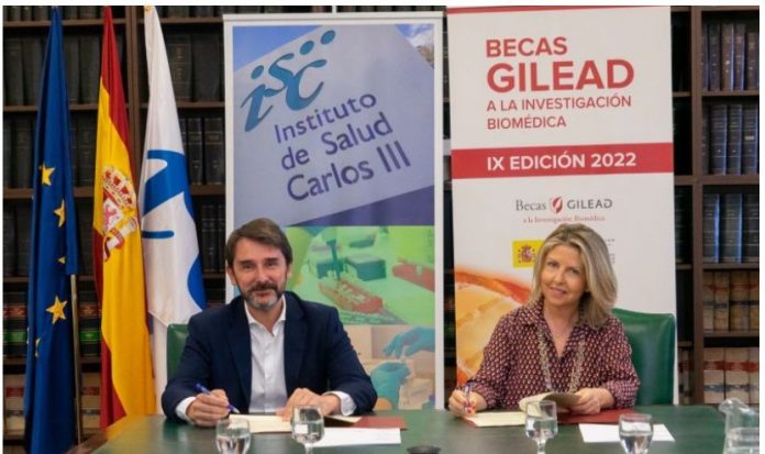 La vicepresidenta y directora general de Gilead España, María Río, y el director general del Instituto de Salud Carlos III (ISCIII), Cristóbal Belda, firmaron este miércoles el convenio de colaboración para la convocatoria de la IX Becas Gilead a la Investigación Biomédica.