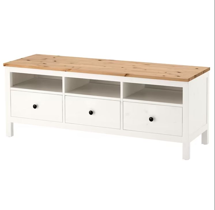 ¿Te has comprado un nuevo televisor y no sabes dónde colocarlo? Pues aquí tienes el mueble de televisión Hemnes para hacerlo. Con unas medidas de 148x47x57 cm, sirve para soportar todo tipo de televisión a la vez que ganas espacio en el salón, ya que tiene tres cajones para guardar cosas y 3 espacios pequeños encima de ellos.
