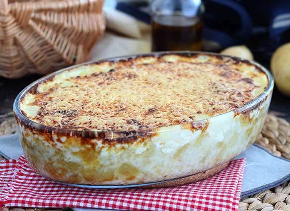 Ahora es el momento de añadir las lascas de bacalao a la sartén en la que tienes la cebolla. Mezcla bien y pasa el contenido de la sartén a una fuente que sea apta para el horno. Cubre con las patatas.