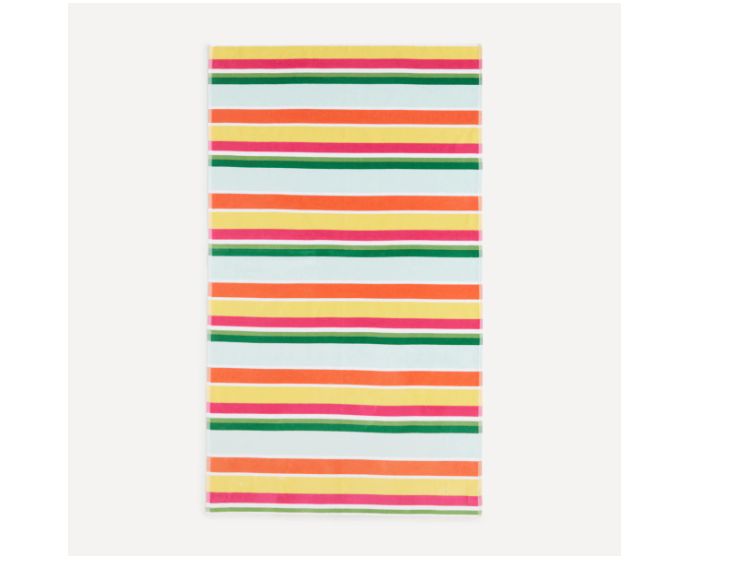 Y seguimos con el conjunto básico para que nada te falte en la piscina o la playa, en tus vacaciones o escapadas. Del modelo que hemos visto antes hay otras opciones con el mismo diseño como la toalla, pero cambiamos el estilo para ser variados y te proponemos esta toalla de playa modelo Cali, en vez de Tropicana, también con un 30% de descuento. Sus medidas son de 90 (ancho) x 160 (largo) cm, de con patchwork multicolor de rayas horizontales y 100% algodón. En este enlace la compras en dos clics por solo 11,85 euros.