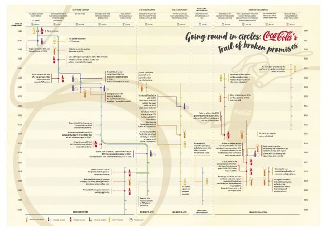 Precisamente Changing Markets lleva tiempo siguiendo la pista a Coca–Cola, a quien acusa de ser la principal compañía responsable de que los residuos plásticos en los océanos. El informe se titula “Habla la basura: el manual corporativo de soluciones falsas a la crisis del plástico» e incluye una infografía en la que desglosa las «promesas rotas» de la multinacional estadounidense en los últimos treinta años.