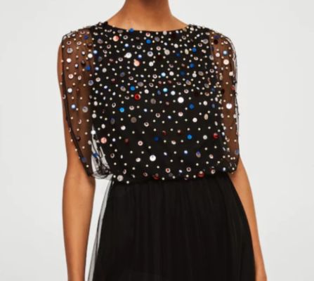 ¿Necesitas algo más elegante para un evento de noche más especial? Pues no te preocupes, no tendrás que gastarte un dineral ya que Mango también pone a tu disposición vestidos de fiesta por un precio bastante bueno. Este vestido de tul con apliques brillantes es un buen ejemplo. Es un vestido elegante y cómodo. Podrás llevarlo a cualquier tipo de evento, ¡Incluso a una boda informal!