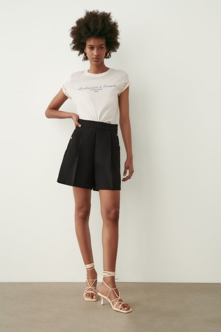 Llevar pantalones cortos en verano no siempre implica recurrir al típico short vaquero. También hay alternativas si quieres lucir un estilismo más cuidado y formal, como esta bermuda de tiro alto con pliegues.