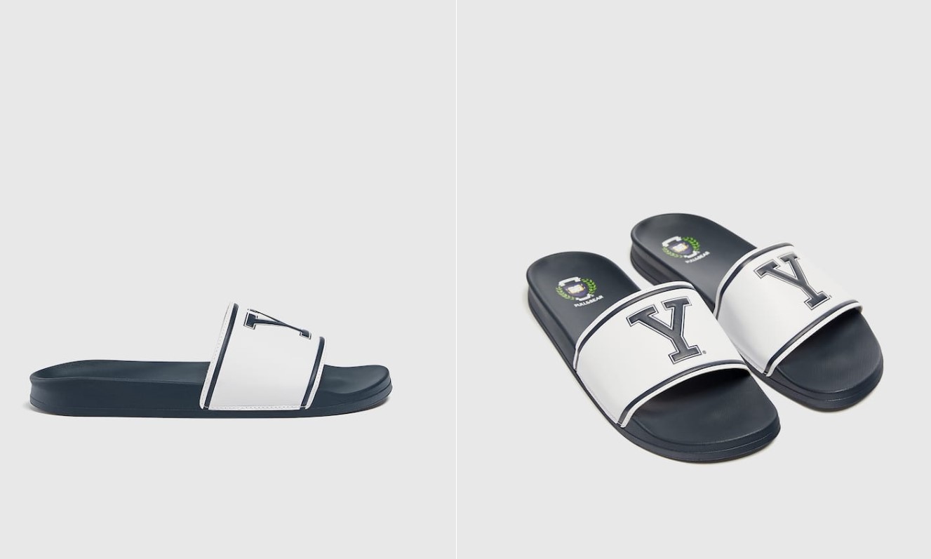 Seguimos con esta lista de sandalias de moda de hombres que encontramos en la tienda de Pull&Bear por menos de 20 euros. Hemos encontrado estas sandalias tipo pala licencia Yale, con el detalle de logo en la parte delantera. Tiene la tira ancha en el empeine y la altura de la suela es de 2 cm. Su composición es 100% poliuretano, al igual que la suela. Las consigues en su tienda web en los talles del 39 al 45. El precio de lista es de 12,99 euros.