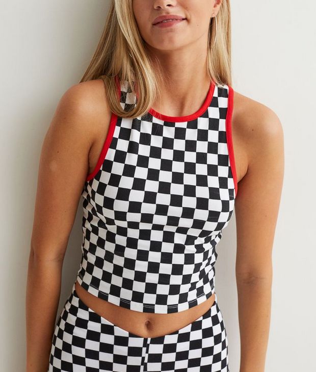Hacía mucho tiempo que no veíamos una prenda tan original como esta que puedes ver en la imagen. Se trata de una camiseta cropped entallada en punto de algodón con espalda olímpica y ribetes a contraste que destaca por su estampado de cuadrados de color blanco y negro y por no tener mangas. Pero lo que más nos ha impresionado ha sido su precio. Piensa que si te decides a comprarla tan solo vas a tener que pagar por ella 2’99 euros en cualquiera de las tiendas que H&M tiene repartidas a lo largo del país.