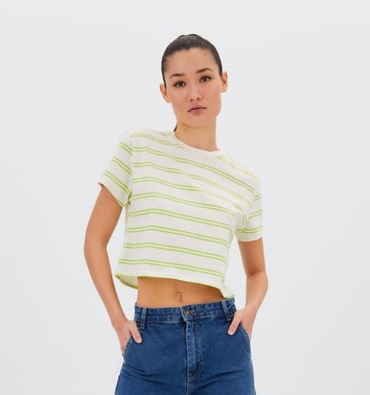 3Camiseta crop de manga corta con rayas, de Stradivarius