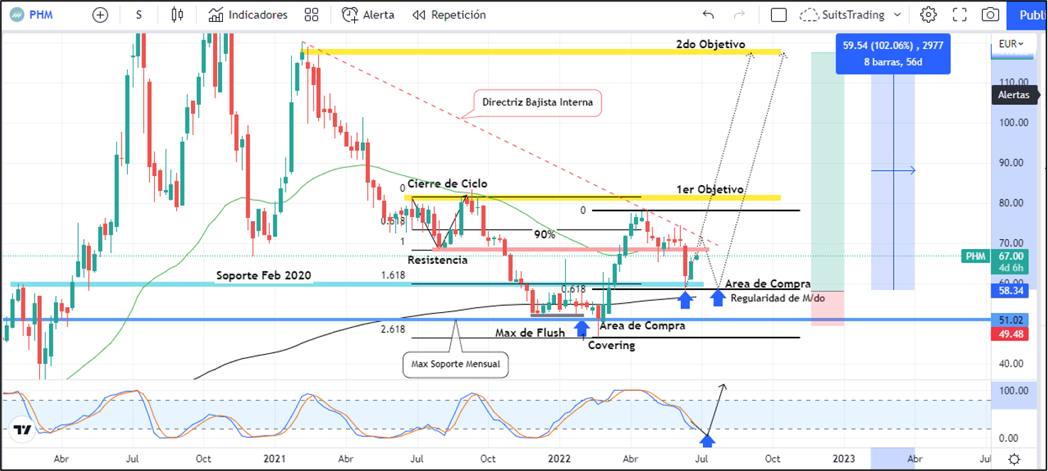 La segunda hipótesis que mayor claridad presenta es el retroceso al área de regularidad habiendo respetado la resistencia y la directriz bajista con lo cual, de hacer el movimiento de truco (V invertida) en el área regularidad, nos daría confirmación para compras en busca de un primer objetivo en el cierre del ciclo en inmediaciones de 81,6 euros y un segundo objetivo en los máximos de febrero de 2021 arriba de 120 euros.