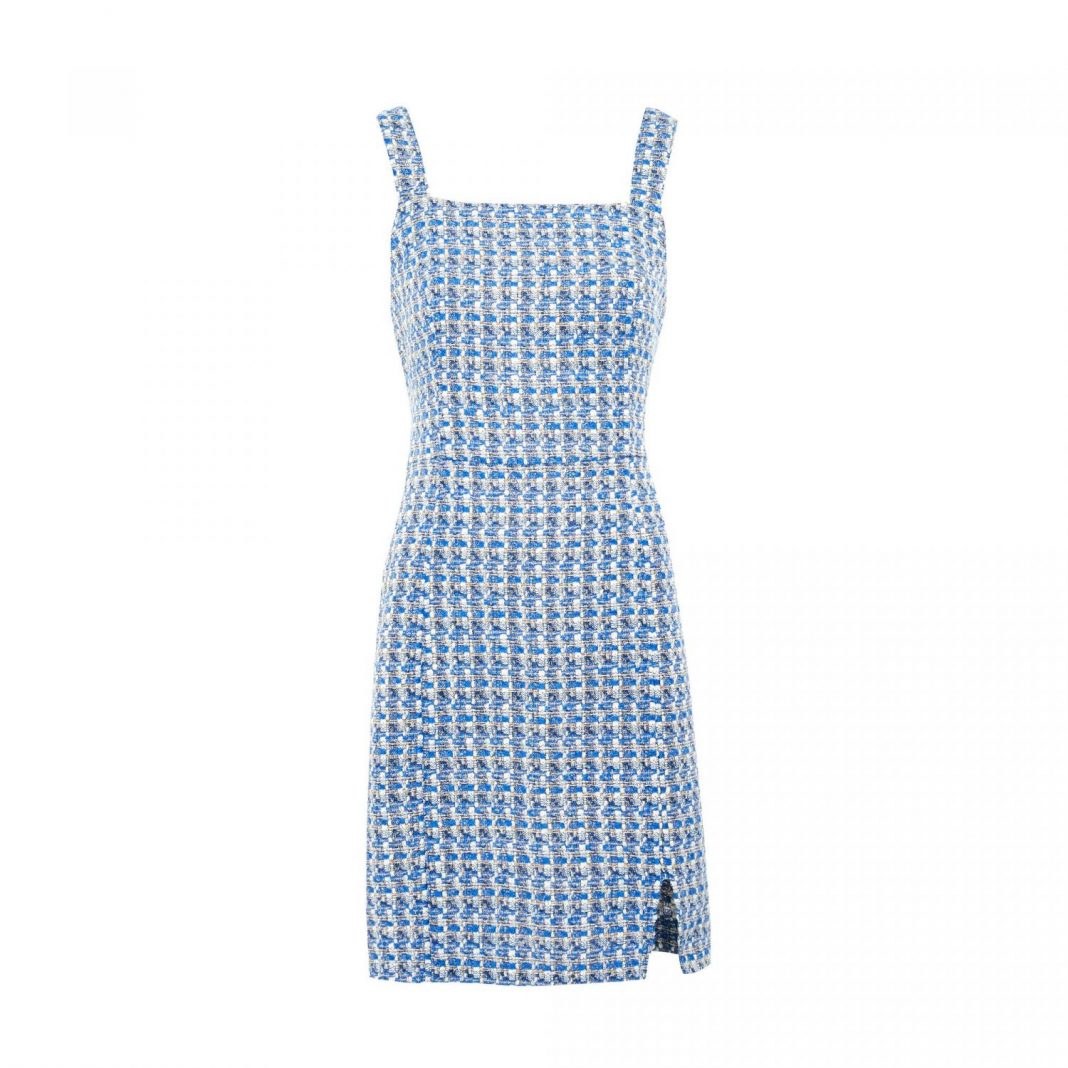Se trata de un vestido a la altura de la rodilla, con escote recto y tirantes anchos. Incluye una pequeña abertura en el lateral para facilitar los movimientos y está confeccionado en un bonito tejido de rizo.