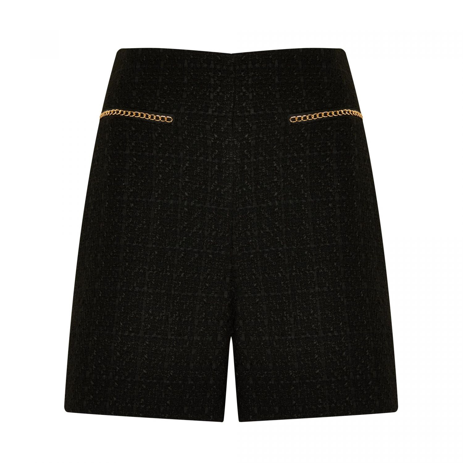 Se trata de un pantalón corto de tejido rizado, en el que el detalle especial lo aporta el ribete de cadena que se puede apreciar en los laterales.