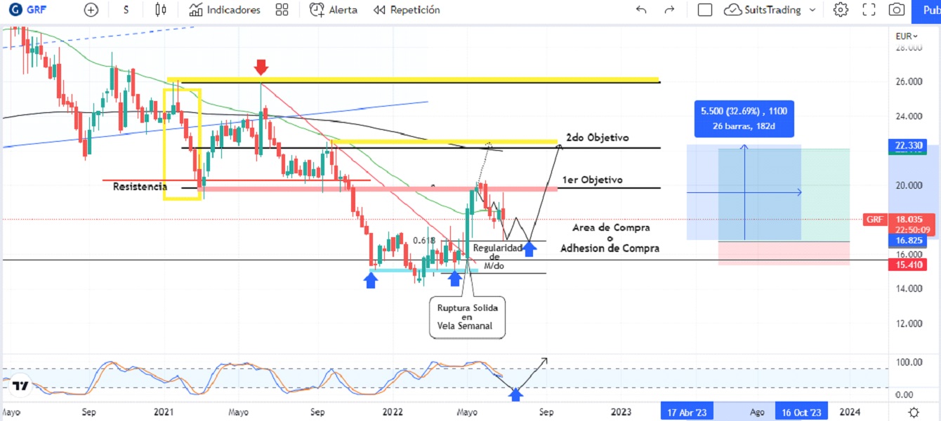 El precio ha de pagar un primer objetivo en su máximo anterior en inmediaciones de 20,14 euros que confluye con la resistencia semanal de marzo de 2021. Una vez el precio realice la ruptura sólida de esta resistencia, nos confirmará la potencial continuación en busca del segundo objetivo establecido en el siguiente máximo de septiembre de 2021 que confluye con el área de regularidad del anterior cierre de ciclo arriba de los 22,2 euros por acción.
