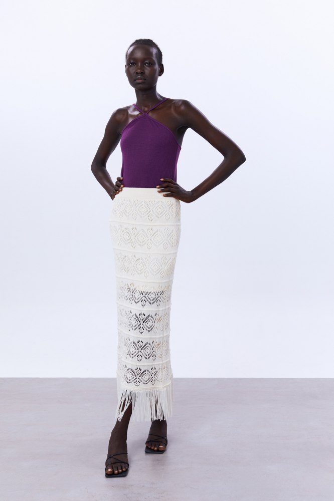 Sus tirantes no se ajustan al hombro sino que rodean el cuello, creando así un efecto escote halter. Te la mostramos en color morado, que es una de las tendencias de este momento, pero está disponible en más colores.