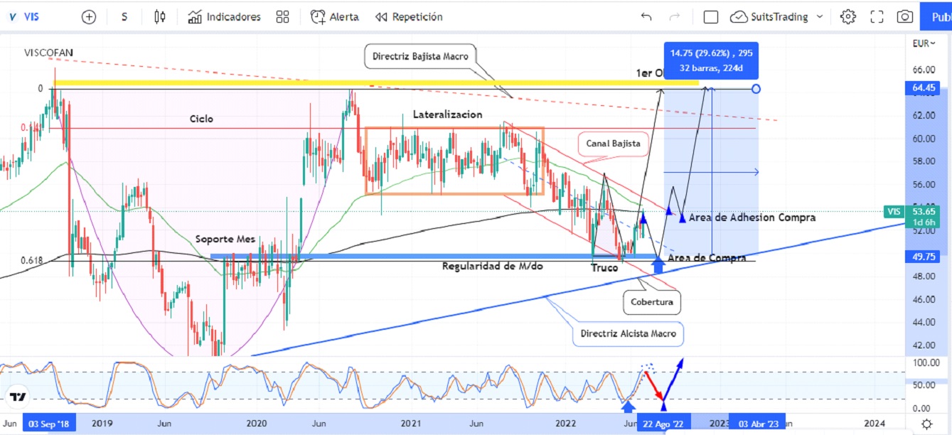 Esta estructura consolida el área como potencial punto de giro al alza la cual preestablece un primer objetivo en el cierre del ciclo macro mensual sobre los 64,2 euros por acción, lo que representa un 30% de beneficio estimado al mediano plazo, niveles acordes a los que entidades como Bankinter han recomendado sobre las acciones de Viscofan.