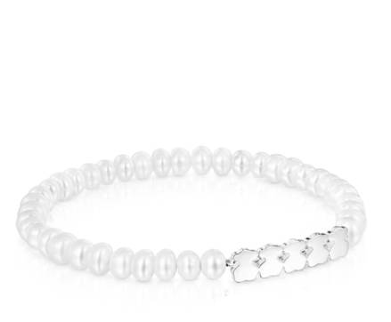 Esta pulsera elástica está hecha a base de perlas cultivadas de agua dulce de 5 mm de diámetro. Lo que la diferencia de otros modelos en el mercado es que incluye una curiosa tira de cinco osos de 5,5 mm.