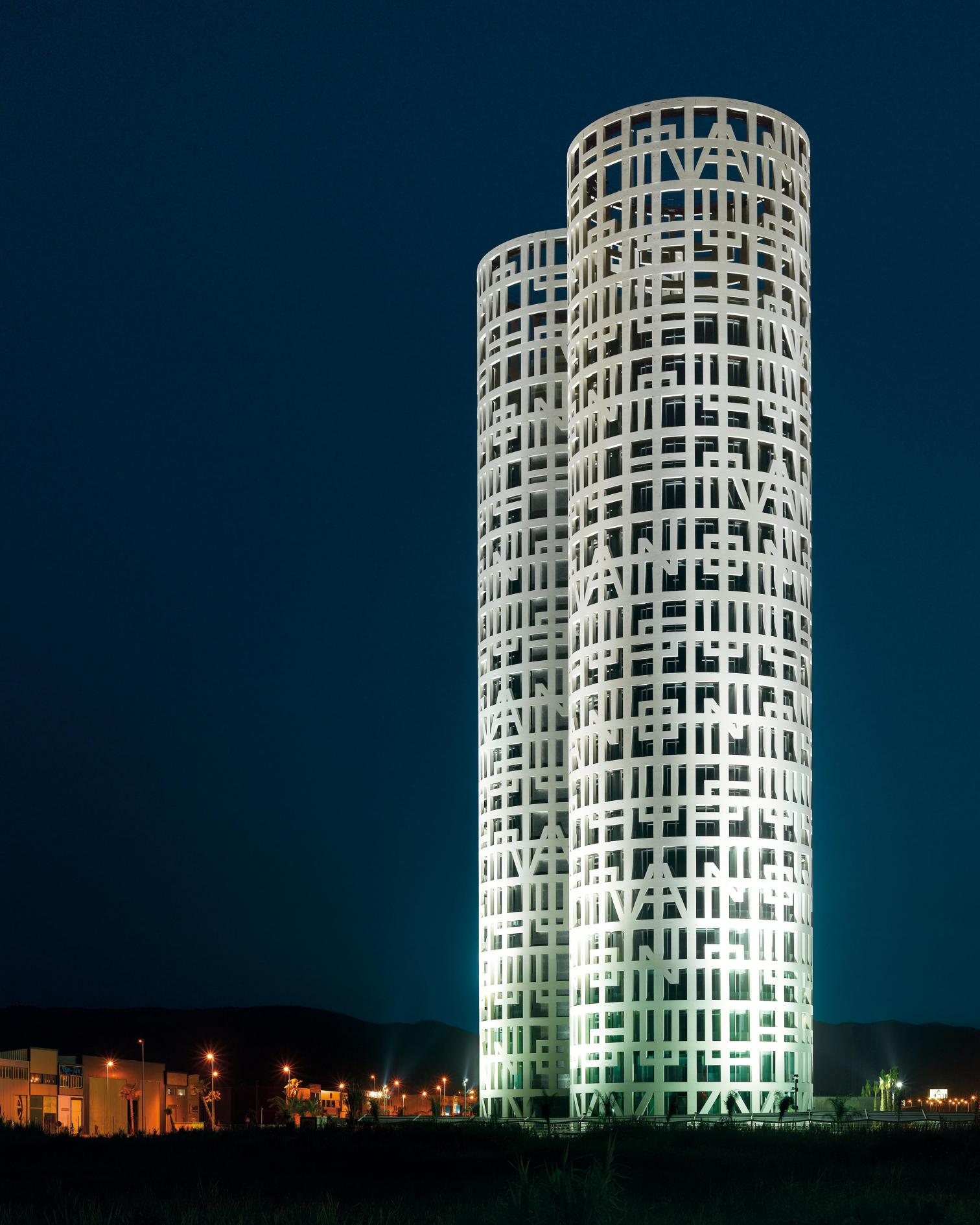 Las torres se ubican prácticamente a nivel del mar en lo que fue una marisma, por lo que la cimentación se ha ejecutado mediante la hinca de pilotes de hormigón armado prefabricados de hasta 40 metros de profundidad. Prácticamente toda la estructura sobre rasante se ha construido en hormigón blanco visto de color arena.
