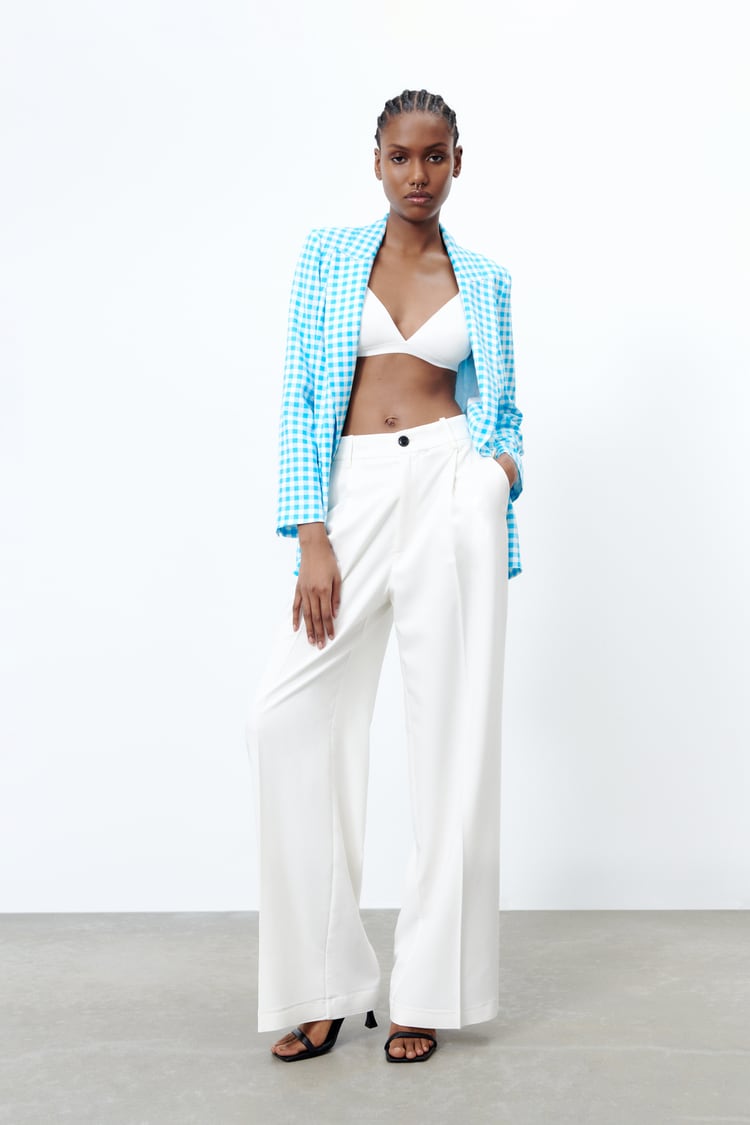 Si incluso en verano tienes que llevar chaqueta, no hay mejor opción que escoger un modelo que sea lo más veraniego posible, como esta bonita blazer de Zara con estampado de cuadros vichy en azul y blanco.