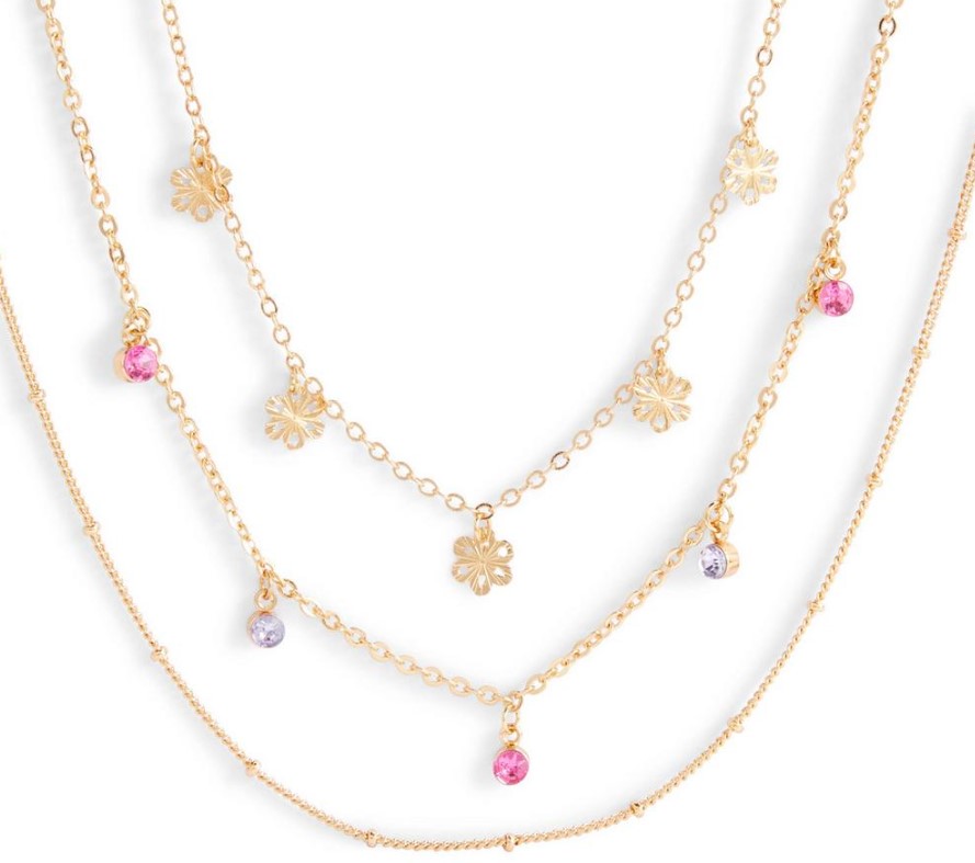 En Primark también hemos visto este collar dorado de triple cadena con dijes de flores que puedes combinar perfectamente con el conjunto. La primera tiene dijes en forma de flores doradas, la segunda pequeños círculos en detalles festivos de colores rosas y blanco, y la tercera tan solo una cadena con bolitas doradas. Es un diseño que por sí solo ya atrapa todas las miradas. Cuesta tan solo 4 euros.