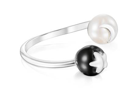 No todo lo que sale de la casa Tous lleva osos, y aquí tenemos un buen ejemplo. Se trata de un original anillo de plata de primera ley, con una perla cultivad de agua dulce de 6mm con una luna y un ónix del mismo tamaño con una estrella.