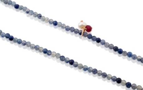 Ha sido creada con plata vermeil rosa y cuarzo con dumortierita, incluyendo una perla. El resultado es un collar perfecto para lucir en cualquier tipo de ocasión.