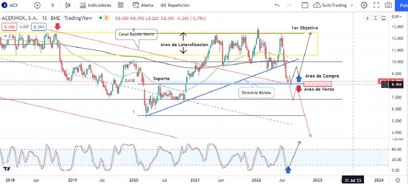 Después de la pandemia las acciones de Acerinox lograron realizar la ruptura del canal bajista macro con el que se estimaba el potencial resurgimiento de la acción en búsqueda de esos 15 euros. Sin embargo, junto a los cuellos de botella provenientes de la pandemia y la llegada de la guerra de Rusia contra Ucrania más la situación real de crisis económica actual, el mercado se ha llenado de pánico lastrando las acciones y que para el caso de Acerinox ha generado quiebres con solidez de la última directriz alcista que se creó desde los mínimos registrados en marzo de 2020, justo por pandemia.