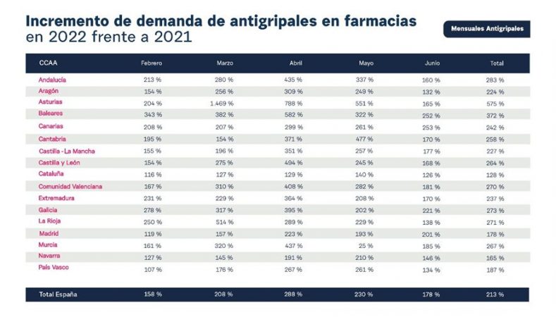 En concreto, en marzo el incremento fue del 208 %, llegando al pico más alto en abril, mes en el que el uso de la mascarilla dejó de ser obligatorio en espacios interiores, con un 288 %. La escalada comenzó a ceder en junio, momento en el que el consumo repuntó solo el 178 %. En términos territoriales, Asturias se sitúa a la cabeza: en el Principado la demanda de antigripales creció en marzo el 1.469 % en términos anuales (para el resto de las comunidades autónomas, consultar tabla en la siguiente página).