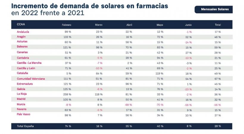 Algo similar ocurre con los productos solares, cuya venta en farmacias también se ha visto incrementada a raíz del fin del uso obligatorio de mascarillas en exteriores en el mes de febrero, lo que favoreció que las personas volvieran a disfrutar de más tiempo al aire libre. A esto habría que añadir que en el periodo comprendido entre febrero y junio se han registrado temperaturas más altas de lo habitual.