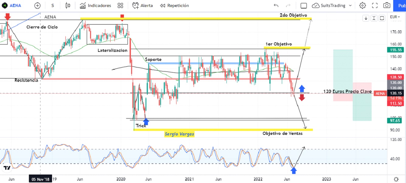 De momento, las acciones de Aena suman ya seis sesiones semanales consecutivas a la baja desvalorizando su acción en un -18,7%, visitando nuevamente niveles de noviembre de 2020. Técnicamente estaríamos alertas del movimiento para la próxima semana del precio, el cual, siempre que respete el área de regularidad sobre los 120 euros que son el punto de inflexión, podría generar punto de giro al alza.