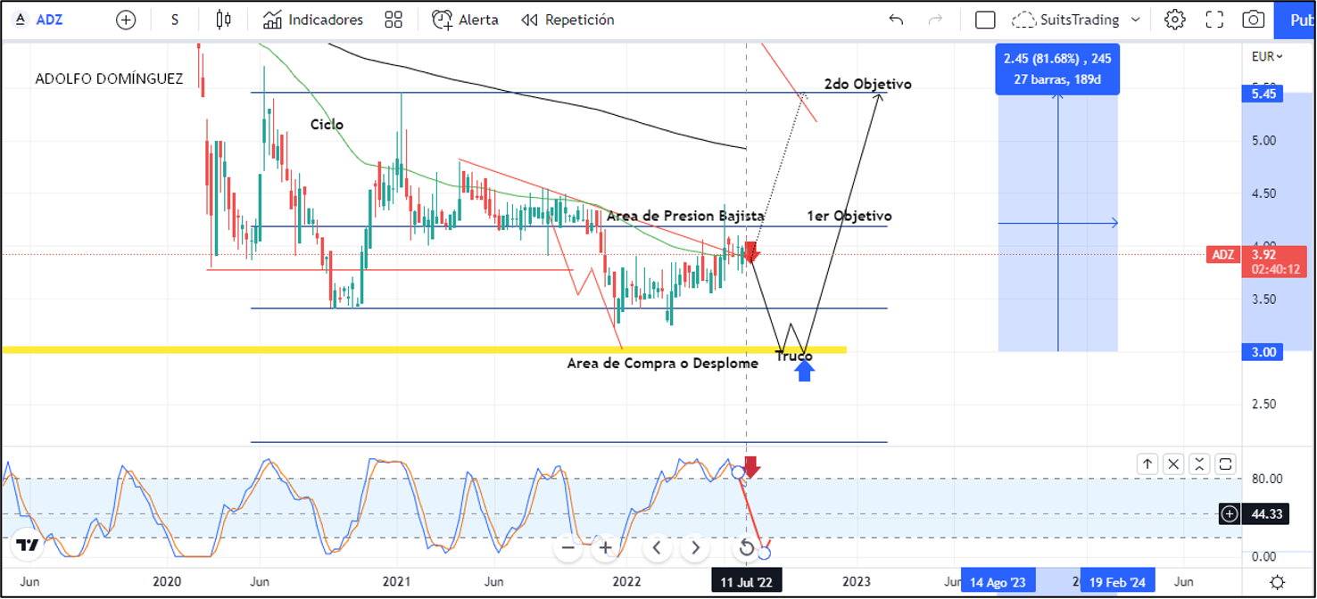 Si estando sobre los 3 euros, realiza una formación de truco y el índice de fuerza relativa se ubica en niveles de punto de giro o, mejor aún, de sobreventa, confirmaría compras de las acciones de Adolfo Domínguezestableciendo un primer objetivo en 4,2 euros por acción que corresponde a la regularidad del ciclo desde donde comienza toda la estructura. Posteriormente un segundo objetivo en el cierre del ciclo macro que corresponde a 5,4 euros por acción. Operación que, de llegar a confirmarse, otorgaría entre un 40% y 80% de beneficio estimado al mediano y largo plazo.