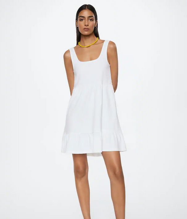 En estos días de rebajas se pueden encontrar muchos chollos en cualquiera de las cadenas de moda que tienen presencia en nuestro país. Pero sin duda las más suculentas se pueden encontrar, otro año más, en las tiendas de Mango. Y este vestido que puedes ver en la imagen es un claro ejemplo de ello. Es una prenda muy especial, que destaca por tener un diseño corto, un cuello escotado, unos tirantes anchos y por no tener mangas. Además, es de color blanco y sale muy bien de precio. Al estar rebajado se queda en 9’99 euros. A continuación te mostramos otras muchas más prendas que merece la pena que veas.