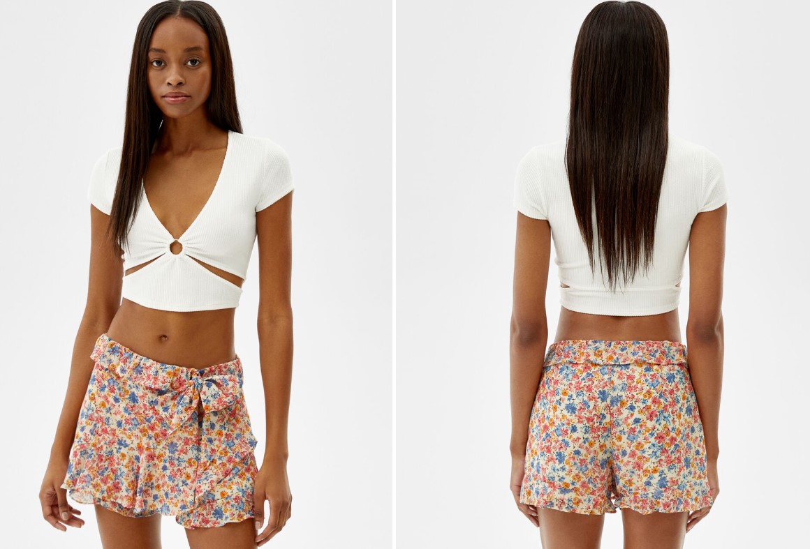 El nombre de ‘skort’ es el resultado de mezclar dos palabras en inglés: ‘skirt’ (falda) y ‘short’ (pantalones cortos). Y es que esta prenda parece una falda por delante, pero en realidad es un pantalón. Este diseño de Bershka combina dos tendencias más, el ‘print’ de flores y los volantes. Se encuentra rebajado a 7,99 euros y cuenta con una versión en otro estampado. Atenta a estos otros chollos.
