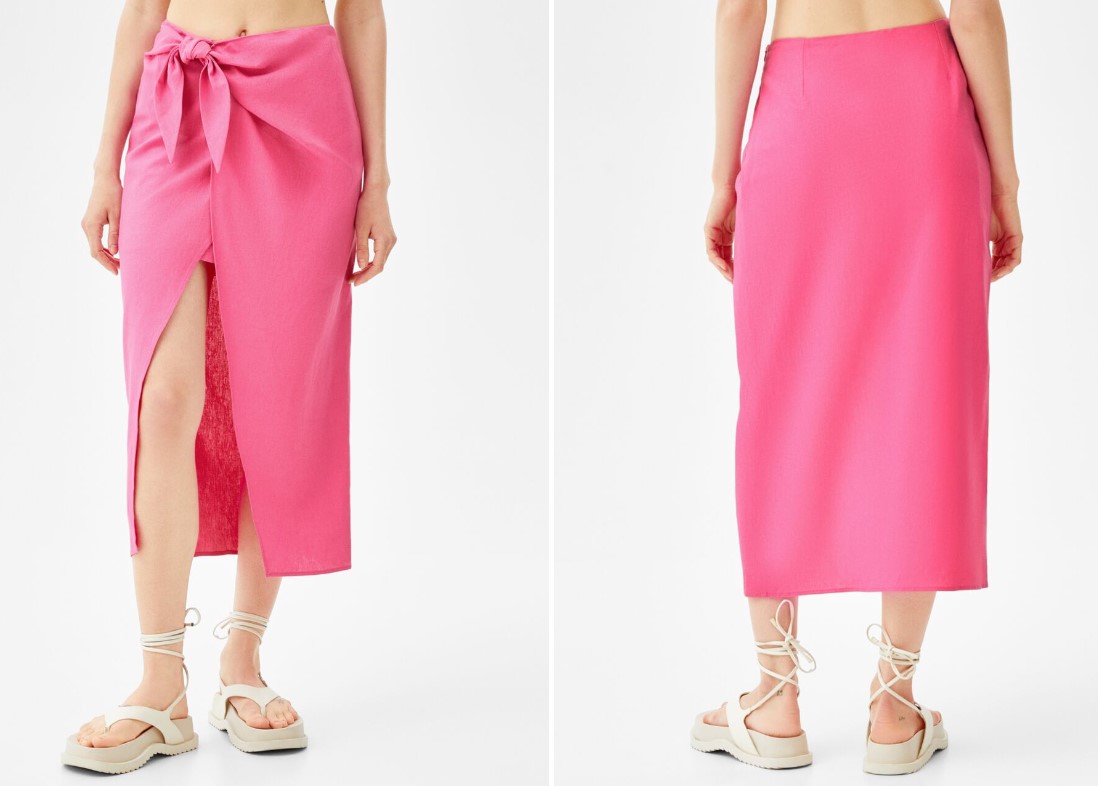 Esta prenda de Bershka también está rebajada. Es una falda midi tejido rústico lazo en un bonito color fucsia, que también puedes conseguir en blanco. Es una prenda diseñada a modo de pareo en tejido 51% lino y 49% viscosa. Su precio está rebajado en un 56% y te la llevas a tu casa por tan solo 9,99 euros.