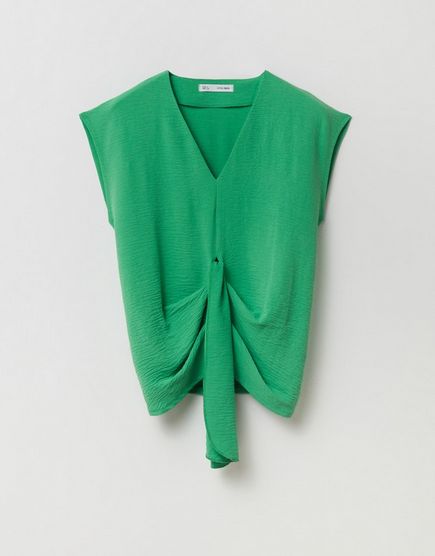 Este diseño de camiseta, lo tiene todo: es cómodo, superestiloso y combina la elegancia con un punto desenfadado del detalle de la lazada en al parte de delante. El corte es muy fluido, con mangas cortas y cuello en forma de pico. El tejido tiene una bonita caída con un efecto ligeramente arrugado, y destaca por un nudo delantero en la cintura. Hay tres colores disponibles: verde, rojo y blanco, y su precio en Sfera es de 11,99€. Busca aquí tu talla.