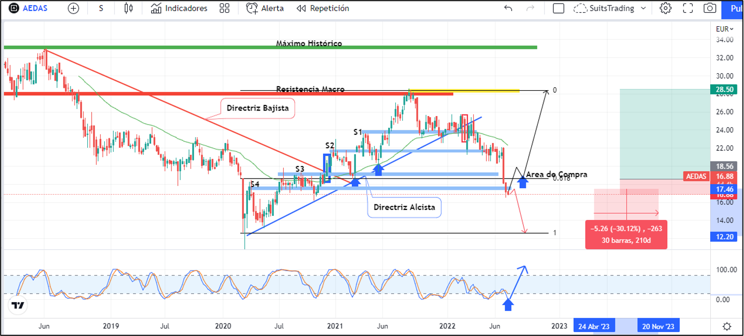 La acción tenía cuatro soportes macro donde podía apoyarse, pero hasta el momento todos los ha quebrado dando una clara idea de la fuerza bajista la cual podría llevar el precio a los mínimos de la pandemia por debajo de los 12 euros, es decir, otro -30% de desvalorización.