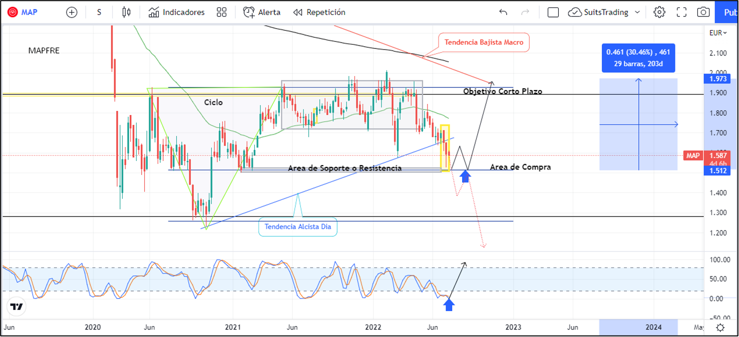 De otra forma, si el precio logra visitar y respetar los 1,5 euros en formación de truco (V invertida), nos indicaría un probable movimiento de punto de giro al alza apoyado del índice de fuerza relativa de gráfico semanal que se encuentra en niveles extremos de sobreventa. Esto podría buscar en un corto plazo, una revalorización hasta los máximos de 2022 del +30% que confluirían con la directriz bajista macro arriba de 1,9 euros por acción.