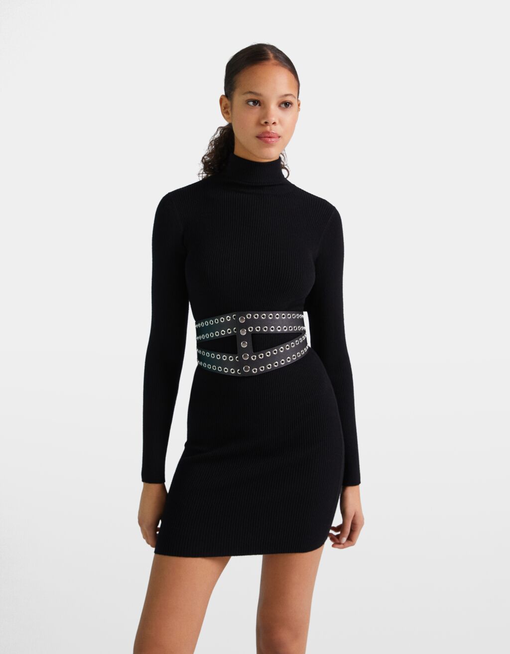 Las rebajas también son un buen momento para llenar tu armario de complementos, como este original cinturón de tachuelas con efecto corset que le dará un toque único a tus estilismos con vestido.
