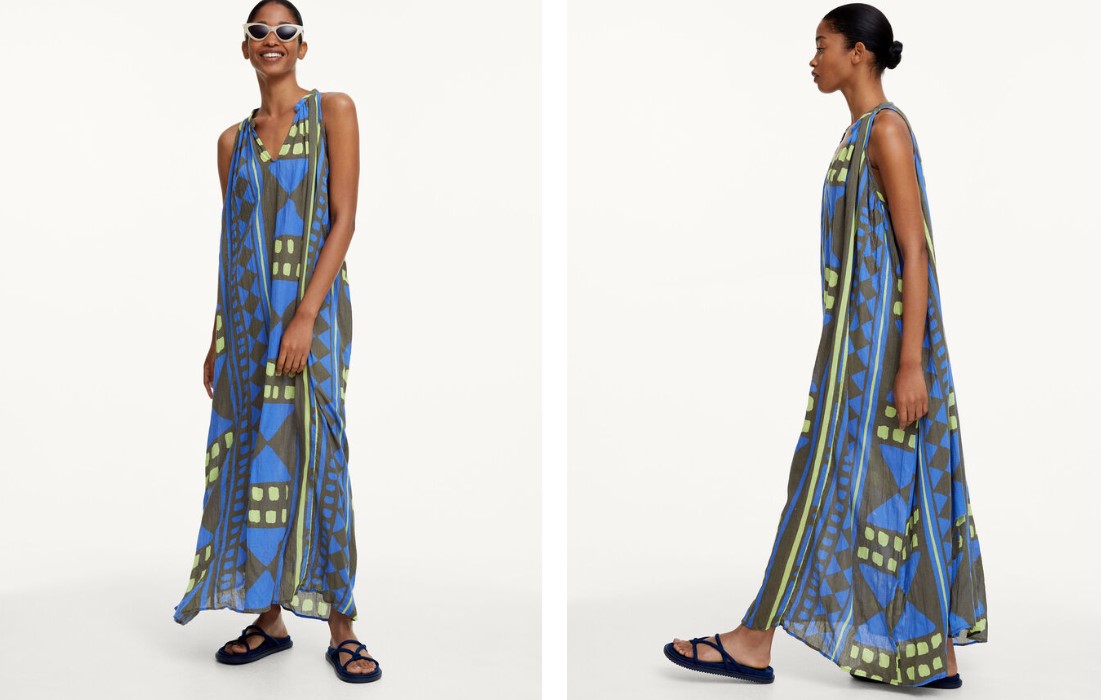 Parfois tiene este caftán que adoramos y nos servirá para todo el verano. Es estampado, sin mangas, de colores vivos y una base azul con tintes amarillos y verdosos. Lo que más encanta también es el escote en pico, que es realmente favorecedor. El caftán es una prenda que sirve para casi absolutamente todo, desde una ocasión para ir bastante arreglada o hasta con un bikini debajo. En concreto, este cuesta 32,99 euros y está disponible en talla única. Hay otro modelo en color blanco para elegir, si no te gusta el tono de este.
