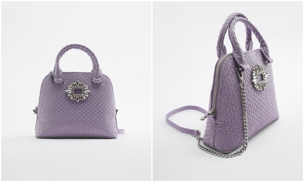 Este bolso de Zara tiene un formato city con cuerpo trenzado y detalle de abalorio en la parte delantera. Asas de mano y asa de cadena extraíble función bandolera, con ajuste de cremallera extendida para su único compartimiento y 2 asas cortas de mano creadas con 80% zamac y 20% papel más un forro de algodón. Mide 19 x 23,2 x 7,5 cm y viene en un lindo color violeta malva o beige, con aplique metalizado de color plata en su parte frontal. Te lo llevas por 9,99 euros.