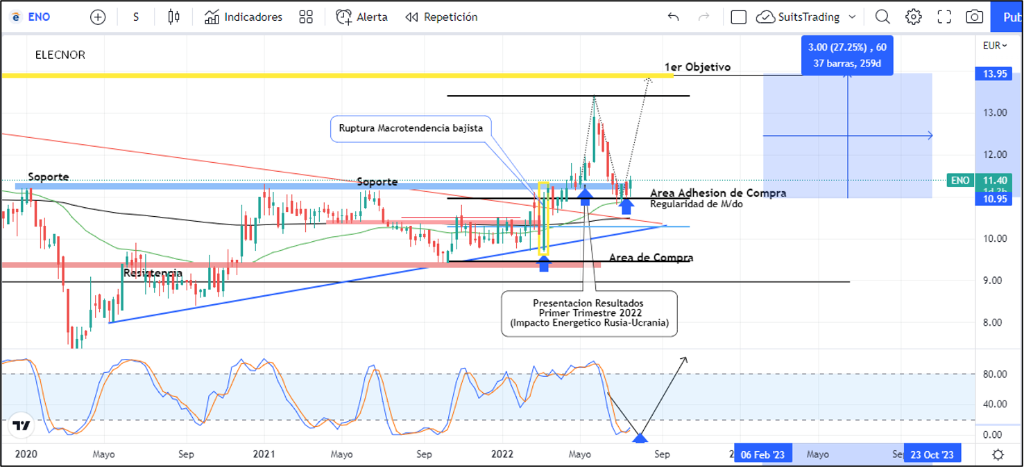 Recordemos que en el trimestre anterior Elecnor mejoró sus beneficios en un 18% alcanzando 25,4 millones de euros e incrementando sus ventas hasta en un 28% en medio del impacto energético que se produjo por la incursión bélica de Rusia contra Ucrania. La mezcla entre la guerra y los buenos resultados financieros, le representaron en menos de 3 semanas, una revalorización de más del 17% a las acciones de Elecnor.