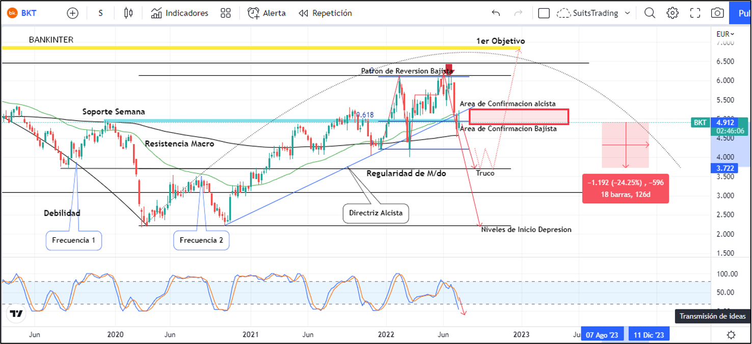 El precio de las acciones de Bankinter ha realizado la ruptura sólida del soporte semanal en 4,9 euros, lo que significa que, de cerrar por debajo de dicho nivel, entraría al área de confirmación bajista que desplomará la acción de Bankinter inicialmente en un -23%.