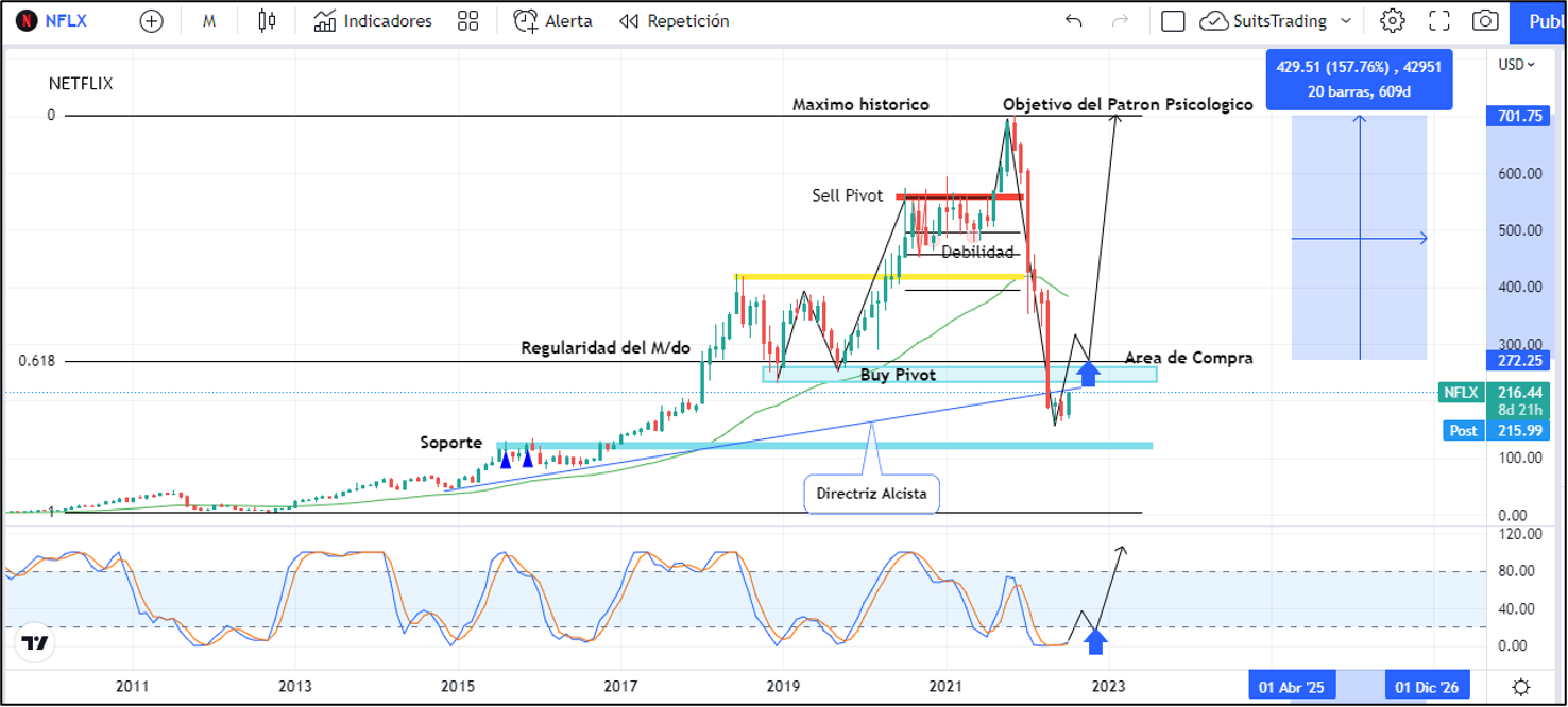 Desde noviembre del año pasado y durante los siguientes 6 meses, las acciones de Netflix dibujaron velas rojas consecutivas que la llevaron a perder hasta el -72,7% de su valor. Por la entrega de los resultados financieros y las proyecciones presentadas, las acciones de Netflix han retomado cerca del +25% en lo corrido del mes dando idea de un punto de giro al alza. Sin embargo, es importante destacar que la acción mantiene un patrón psicológico macro que se activará al alza solo si se vuelve a ubicar sobre los 272 dólares por acción de acuerdo con los lineamientos que compartimos en la gráfica mensual.