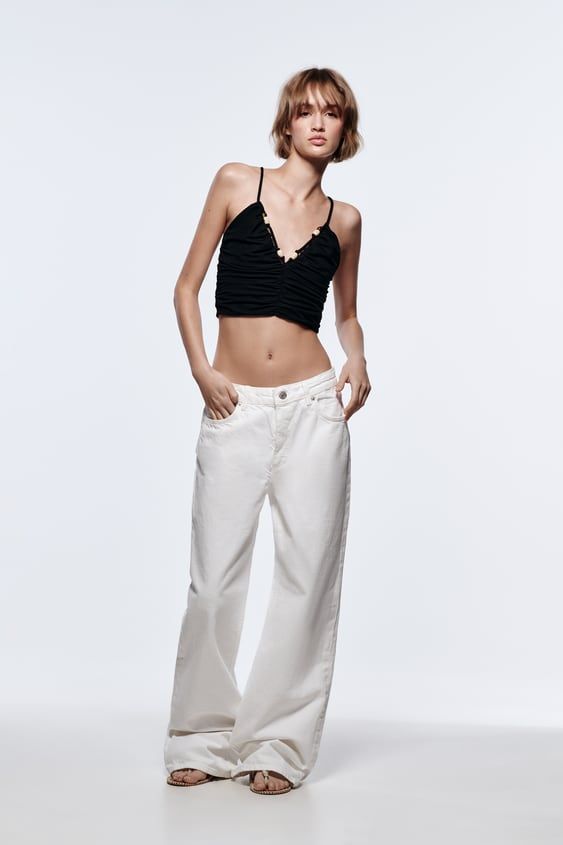 Camisetas y tops van de la mano, ya que son perfectos para variar en verano en cuanto a atuendo superior. Si quieres lucir hombros o como en este caso, también ombligo, el top es tu prenda. En Zara hay un montón en rebajas, pero nos quedamos primero con este de escote pico y tirantes finos, con detalle de abalorios combinados a contraste. Con el 66% de descuento se queda en 5,99 euros.