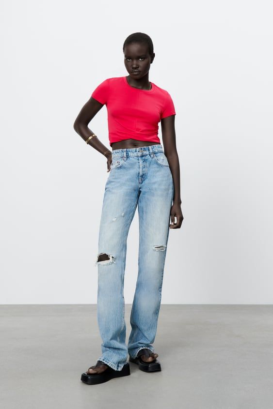 Veamos otro modelo de lo más original en Zara, una camiseta con cuello redondo y manga corta. Pero lo más interesante la parte inferior, con ese efecto nudo tan favorecedor. Se vende en verde o fucsia, y la tienes con otro descuentazo del 59% y un precio de 3,99 euros. Es una prenda perfecta para combinar con vaqueros o cualquier pantalón, por ejemplo amplio o pirata, tan de verano. Otra camiseta que deberá estar en tu maleta vacacional si o si.