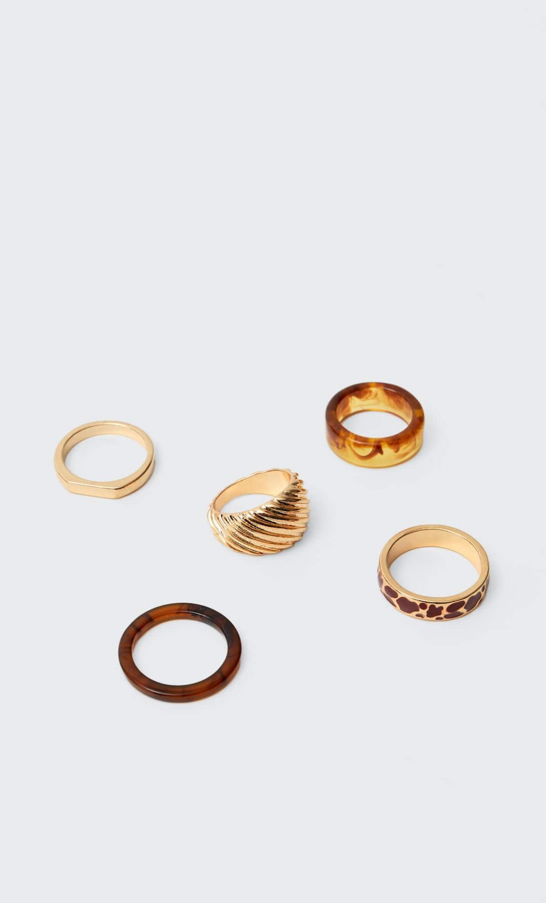 Con este set de anillos en tu joyero siempre vas a tener a mano el accesorio que necesitas en cada momento, porque hay piezas para cada ocasión. Empezando con tres anillos sencillos en tono dorado.