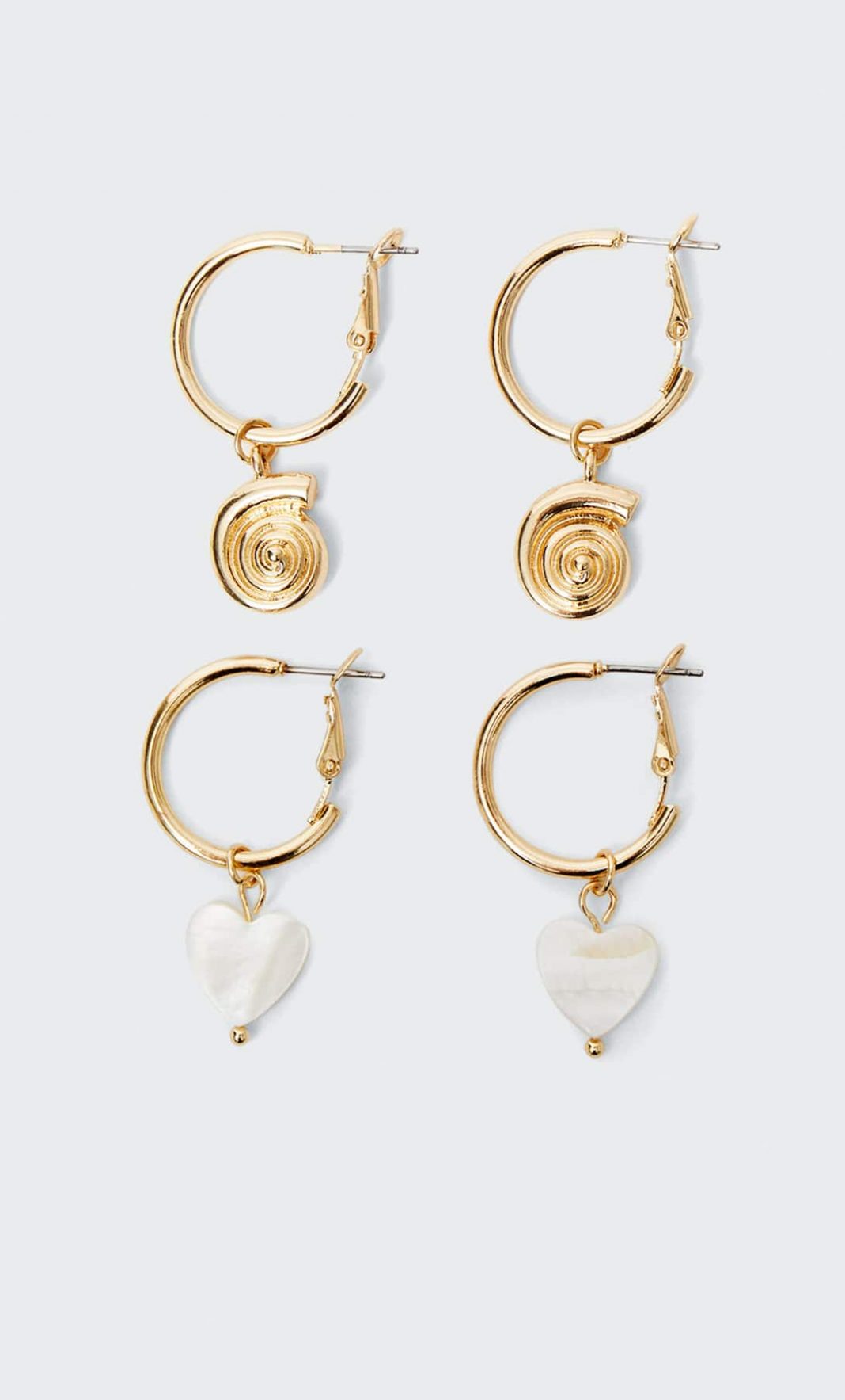 Se trata de dos pares de pendientes de en color dorado. De uno de ellos cuelga una original caracola y del otro una pieza de efecto similar al nácar con forma de corazón. Quedan muy bien si combinas ambos.