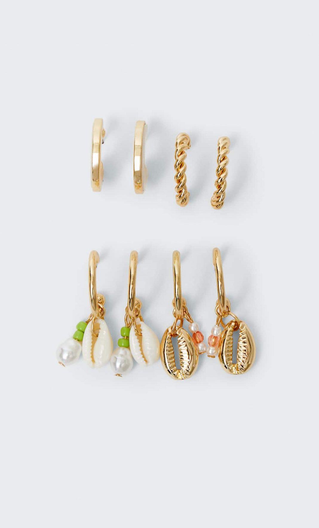 Sin lugar a dudas, este puede ser uno de los sets de pendientes más veraniegos de Stradivarius para esta temporada, especialmente por los dos modelos que tienen charms en forma de concha. Uno en color dorado y el otro en blanco.