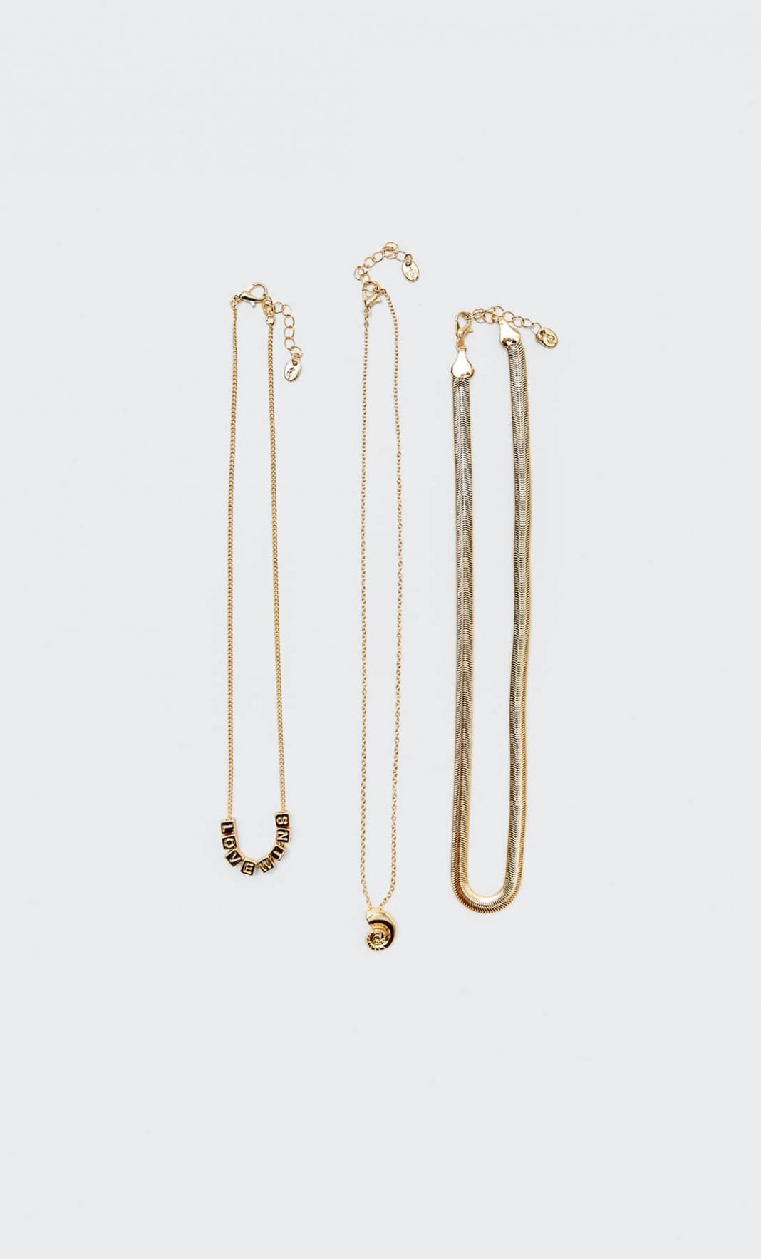 Incluye una cadena de corte más grueso, un collar fino con unos abalorios que conforman un mensaje y otro collar del que cuelga una delicada concha en tonos dorados.